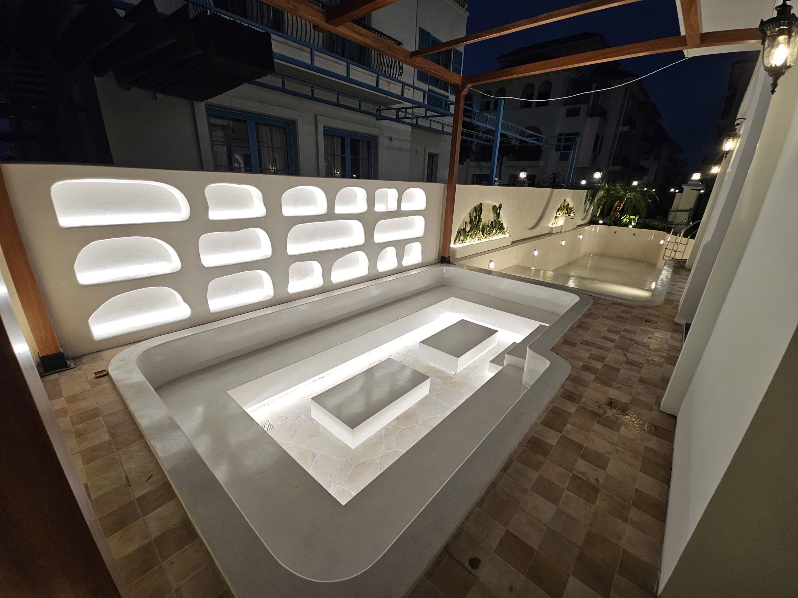 Hồ bơi trung tâm với quy mô lớn đã gần như hoàn thiện, sẵn sàng trở thành điểm nhấn nổi bật nhất của villa. Các khu vực phòng khách, bếp, phòng ngủ và không gian giải trí cũng đang trong giai đoạn hoàn thiện cuối, đảm bảo mang lại trải nghiệm trọn vẹn ngay từ những ngày đầu vận hành.