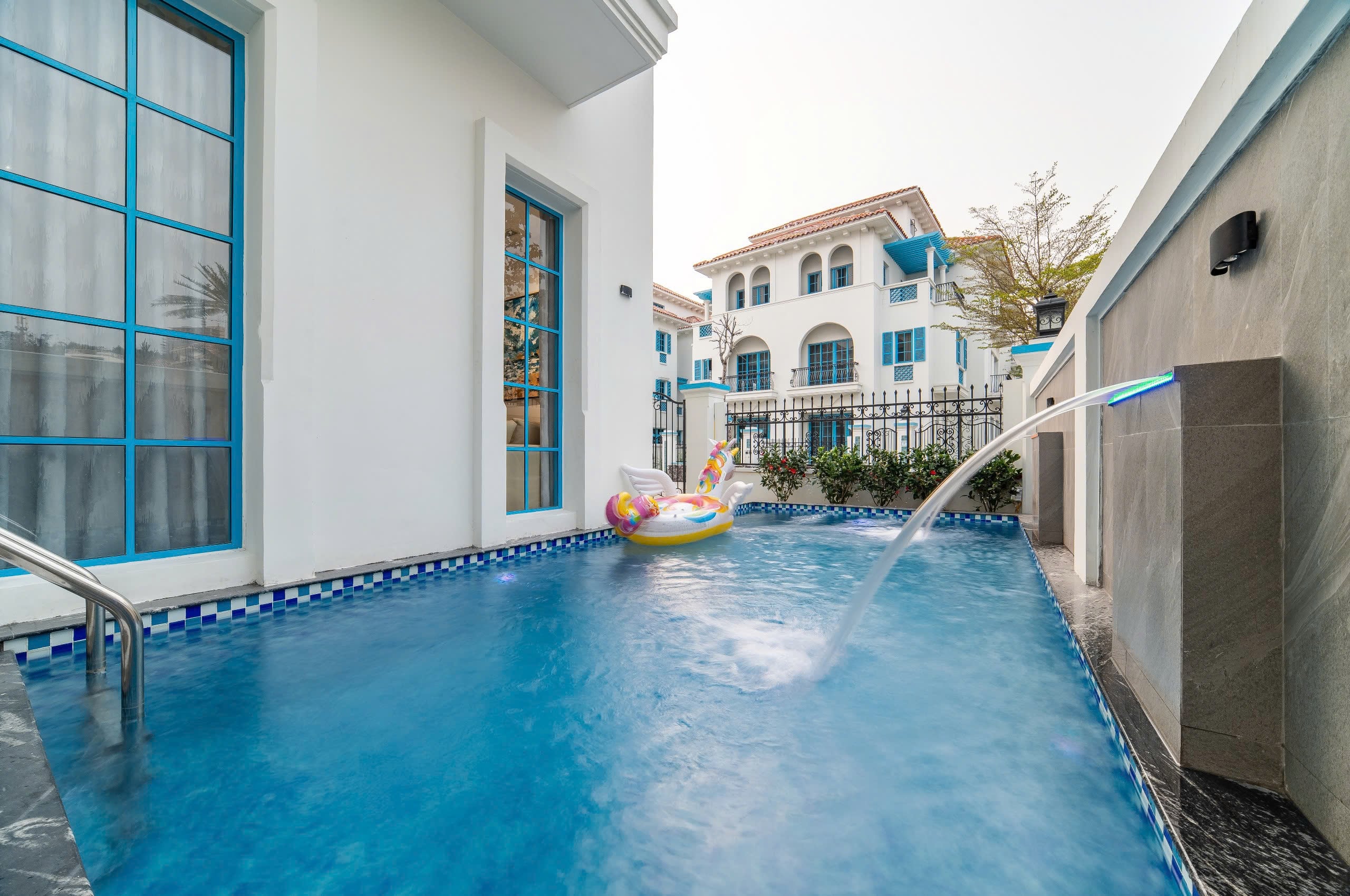 Điểm nổi bật: Hồ bơi tràn viền, tone trắng – xanh bắt sáng, decor tinh tế