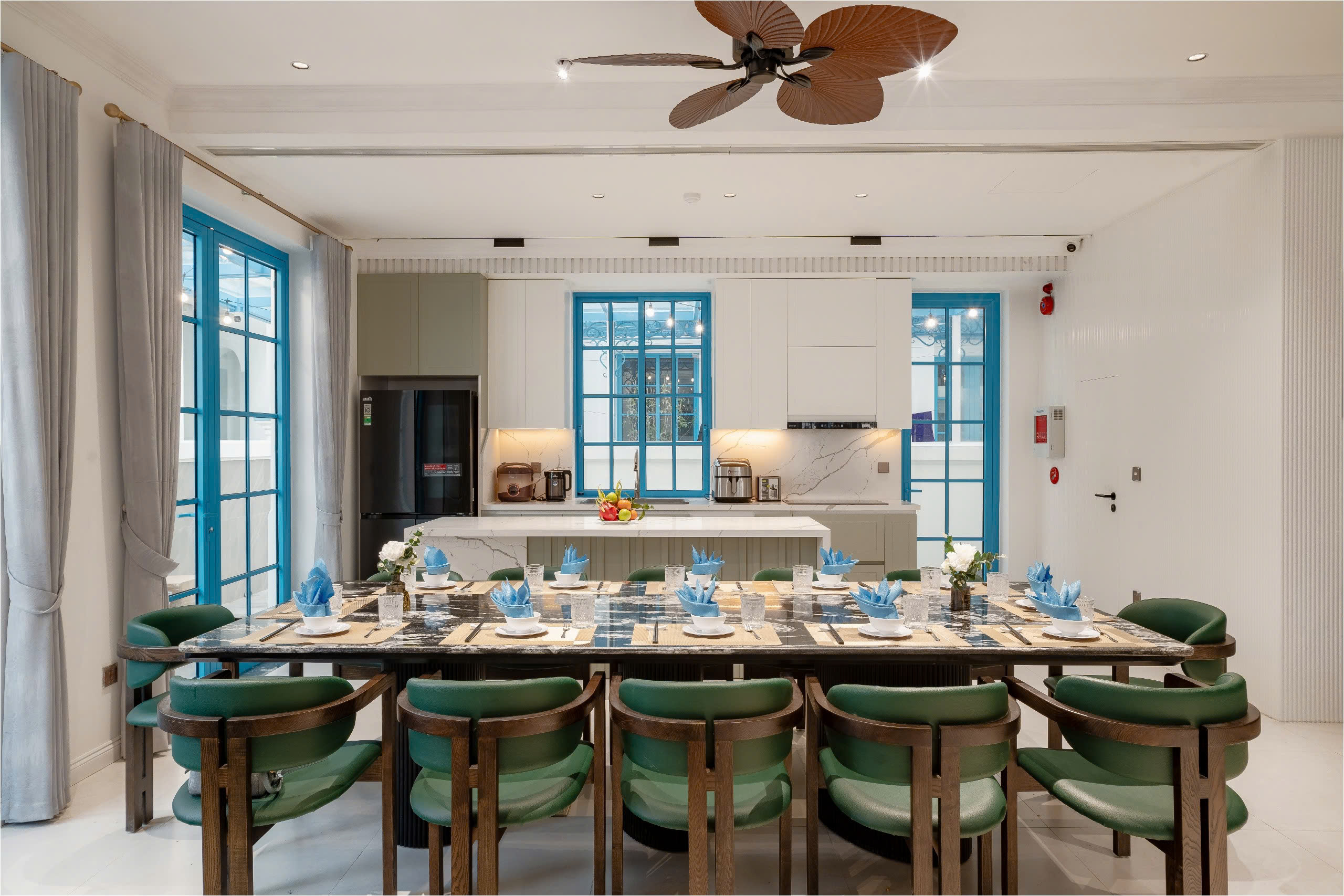 Không phải ai cũng thích ăn ngoài 3 bữa/ngày, nhất là khi có trẻ nhỏ, người ăn chay hoặc có chế độ ăn đặc biệt. Biệt thự nguyên căn thường trang bị bếp đầy đủ tiện nghi – từ nồi cơm điện, bếp từ đến lò vi sóng và chén bát sẵn có. Chợ cá Bãi Cháy hay chợ Hạ Long chỉ cách vài phút đi xe, rất tiện để bạn mua hải sản tươi sống, tự tay chế biến tại villa – vừa sạch, vừa tiết kiệm.